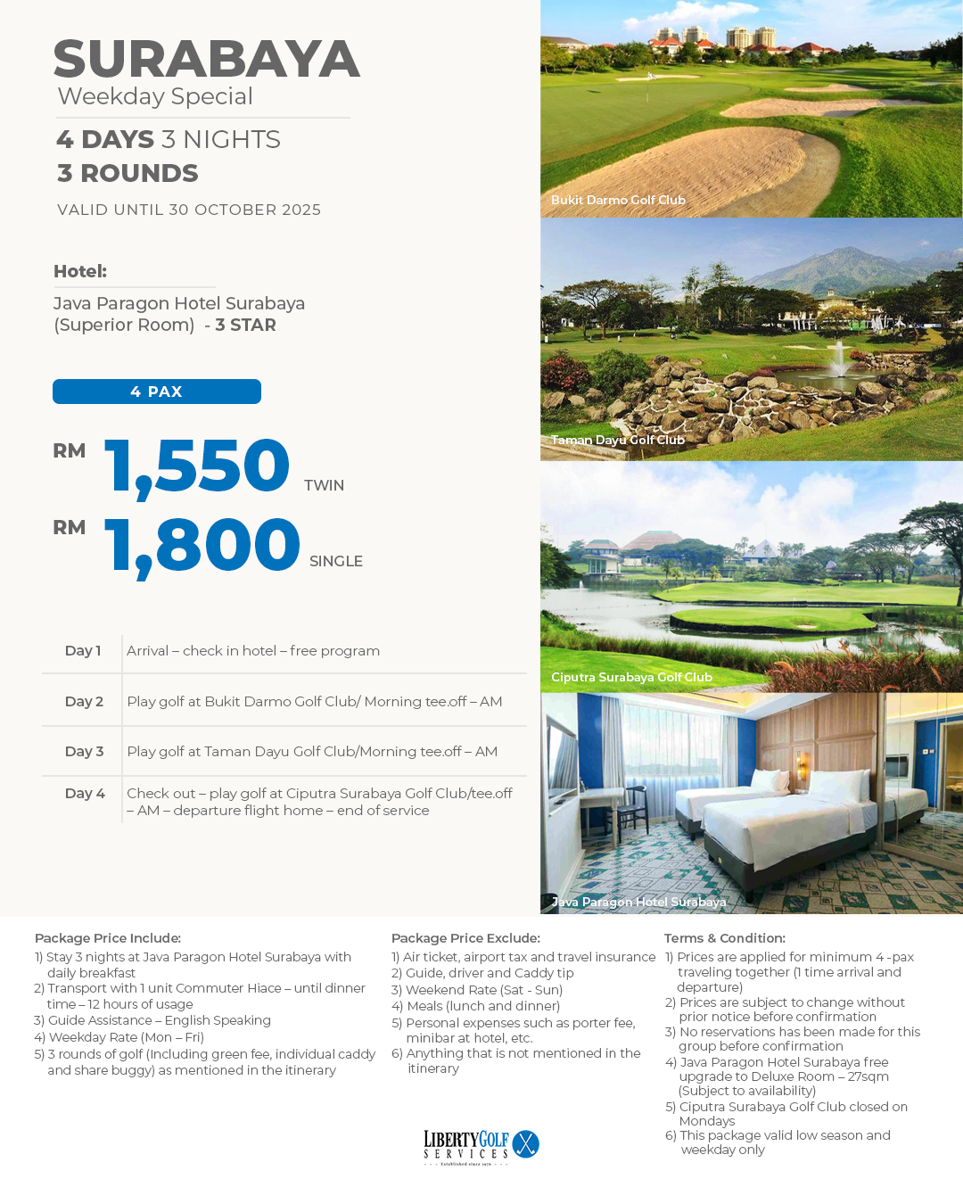 • Day 4: Check out – play golf at Ciputra Surabaya Golf Club/tee.off – AM – departure flight home – end of service